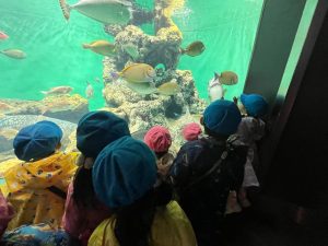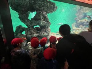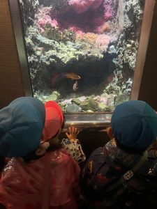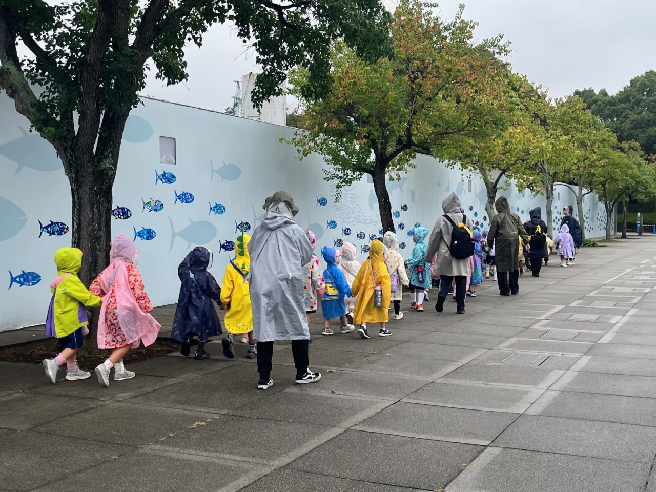 駐車場から水族園まで歩く途中で霧雨のような雨に見舞われましたが、子どもたちの体が冷えてしまうほどの雨ではなく、特に問題なく、水族園に到着し、館内の見学をみんなで楽しむことができました。
